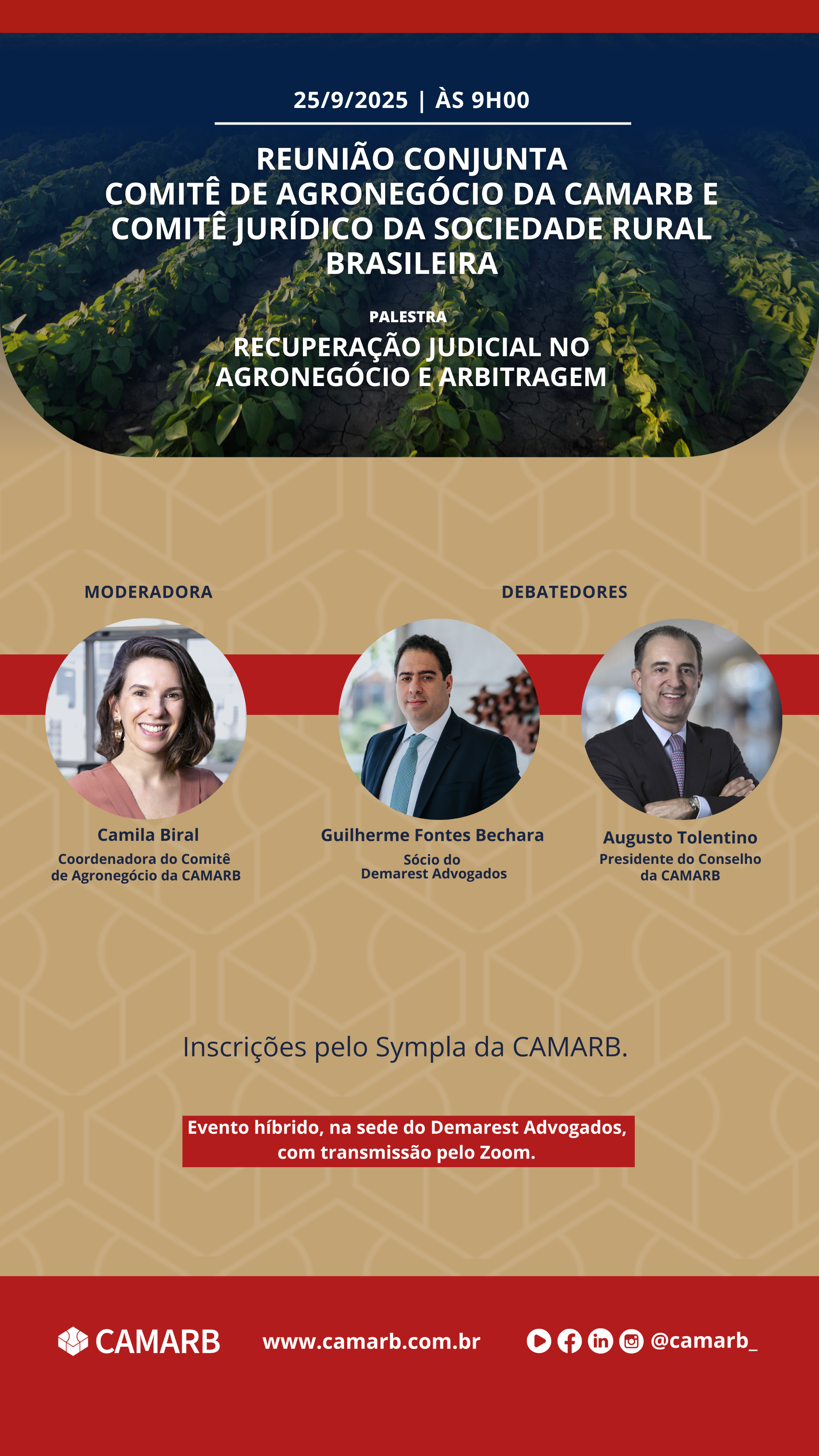 No dia 25/9, às 9h, o Comitê de Agronegócio da CAMARB - Câmara de Mediação e Arbitragem Empresarial - Brasil promove reunião conjunta com o Comitê Jurídico da Sociedade Rural Brasileira sobre "Recuperação judicial no Agronegócio e Arbitragem". (Clique aqui)