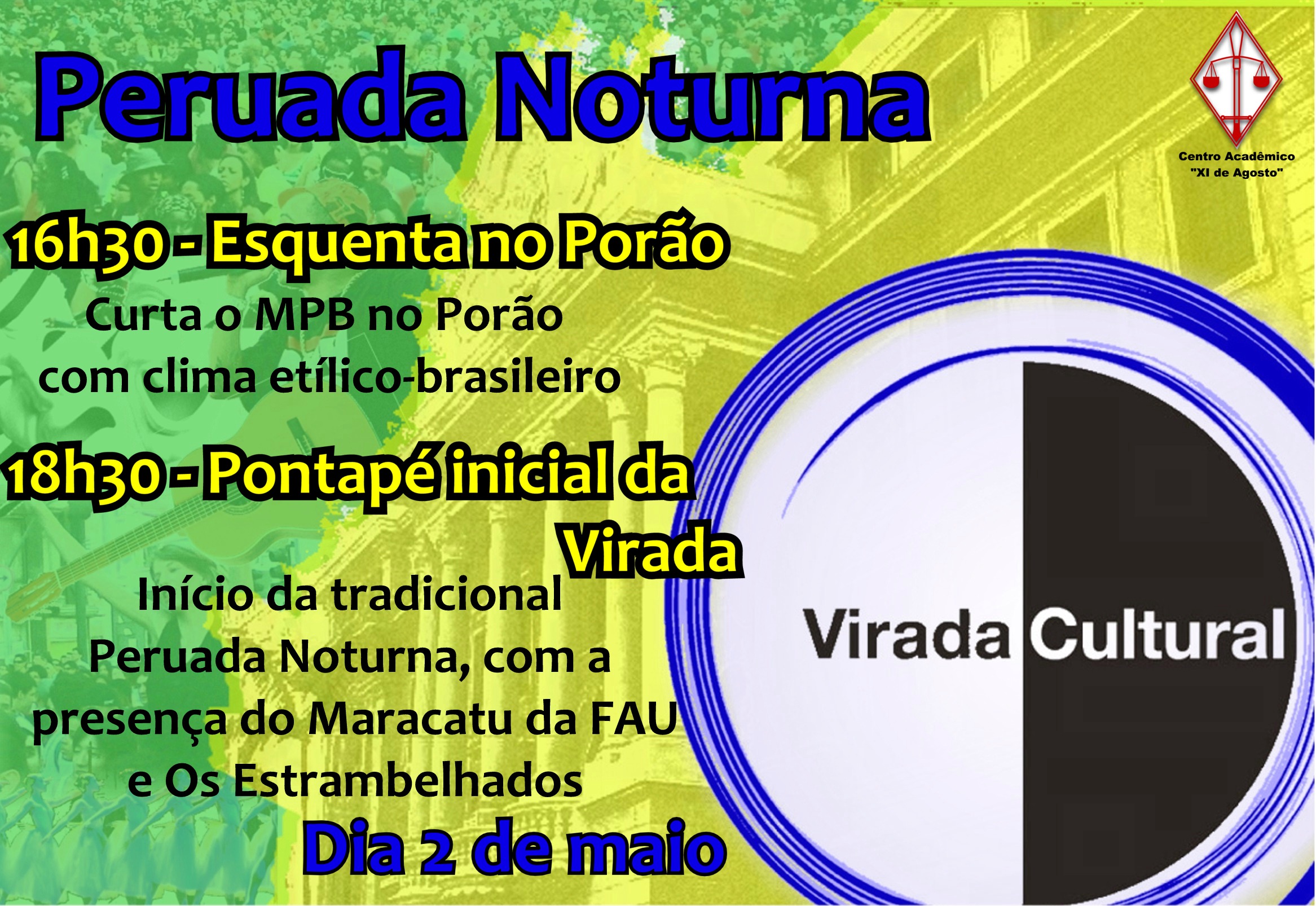 Vem aí a Virada Cultural de SP, que acontece nos próximos dias 2 e 3/5. O Centro Acadêmico "XI de Agosto" não vai ficar de fora, e participa com a tradicional Peruada Noturna. (Clique aqui)