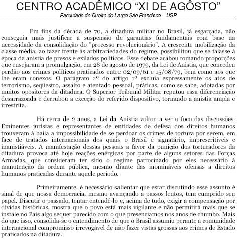 Centro Acadêmico XI de Agosto divulga manifesto sobre a questão da flexibilização da interpretação da Lei da Anistia