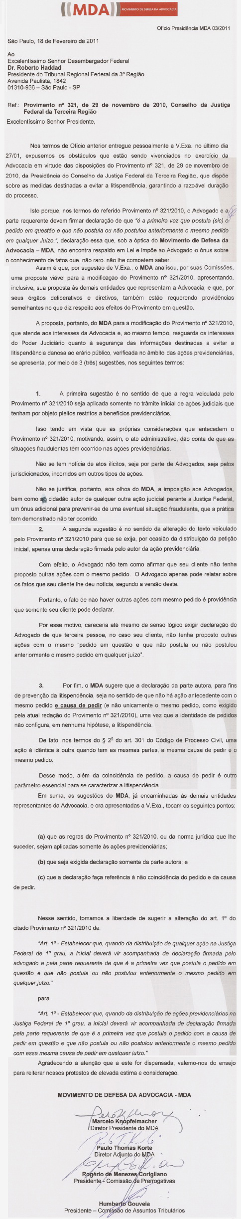 MDA apresenta ao TRF da 3ª região sugestões para a modificação do provimento 321/10