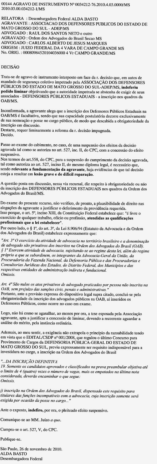 TRF 3ª região nega liminar para que defensor público seja dispensado de inscrição na OAB