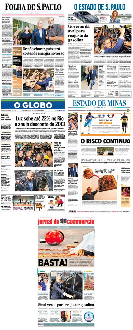 Contraste: Capas dos jornais de hoje são ilustradas por Aécio sorridente e Dirceu deixando o cárcere