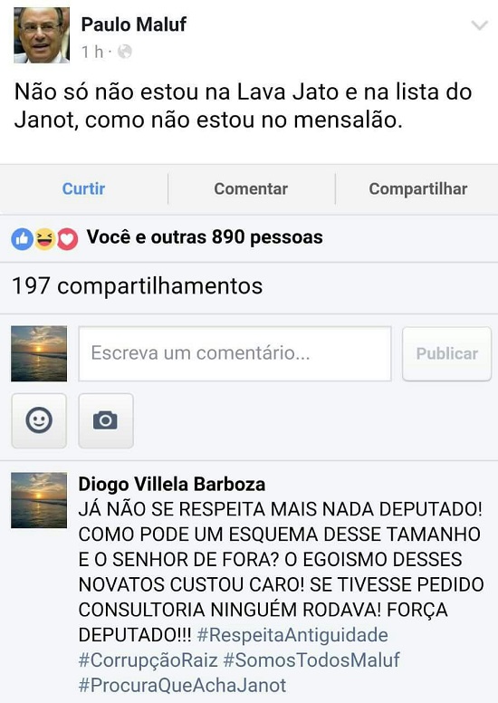 Corre na internet, com toda a criatividade de que o brasileiro é capaz, memes de lamentação diante da ausência de alguns nomes na esperada lista do Janot. Um que se destaca é o do deputado Paulo Maluf, como prova de que os tempos realmente estão mudados.