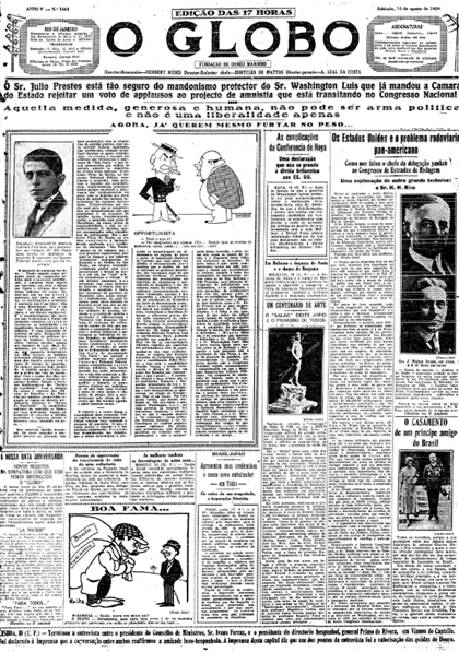 Há 88 anos, no dia 10 de agosto de 1929, o jornal O Globo publicou que o então governador de SP Júlio Prestes estava seguro com o mandonismo protetor do presidente Washington Luís, mandando rejeitar, na Câmara do Estado, um voto de aplauso ao projeto de anistia que estaria transitando ao Congresso Nacional.