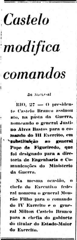 Há 54 anos, no dia 27 de junho de 1964, o presidente Castelo Branco nomeou o general Justino Alves Bastos para o comando do III Exército, em substituição ao general Pope de Figueiredo. Na mesma ocasião, nomeou os generais Mourão Filho e Milton Castelo Branco para o comando do IV Exército e chefia do gabinete do titular do Estado-Maior do Exército, respectivamente.