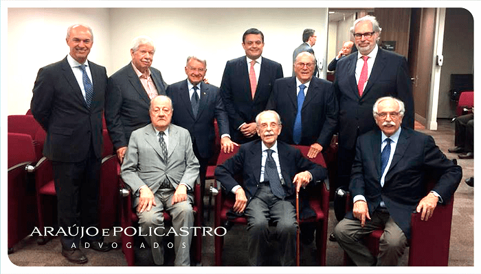 Na imagem, Décio Policastro (3º em pé, da esquerda para a direita), sócio do escritório Araújo e Policastro Advogados, ex-conselheiro e associado remido do IASP, na companhia dos advogados (em pé, da esquerda para a direita) Vitorino Antunes, Luiz Ignácio Homem de Mello (conselheiro), Renato Silveira (presidente), professor Miguel Reale e professor Eduardo Muylaert. Sentados (da esquerda para a direita), professor Fábio Nusdeo, Mário Sérgio Duarte Garcia e professor Modesto Carvalhosa.