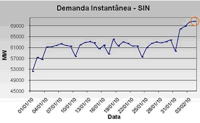 No que diz respeito à Geração de energia, é importante observar as características da evolução da carga e do parque energético brasileiro. Conforme o boletim especial divulgado pela ONS1, no dia 4/2/10 registrou-se um recorde de demanda instantânea no Sistema Integrado Nacional - SIN (conforme Gráfico 1), o qual atingiu 70.654 MW (Megawatts) de demanda às 14h49min, ocasionado por força da elevação da temperatura em todo o país. A título de exemplo, na Região Sudeste as temperaturas atingiram o patamar de 36ºC, na Região Sul 35ºC, na Região Norte 34ºC, e na Região Nordeste 32ºC.