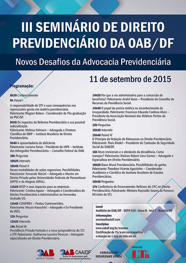 Luciana Moraes de Farias, presidente do IAPE - Instituto dos Advogados Previdenciários - Conselho Federal, palestrará sobre "A aposentadoria do deficiente", durante o evento "III Seminário de Direito Previdenciário da OAB/DF", que acontece dia 11/9, em Brasília. (Clique aqui)