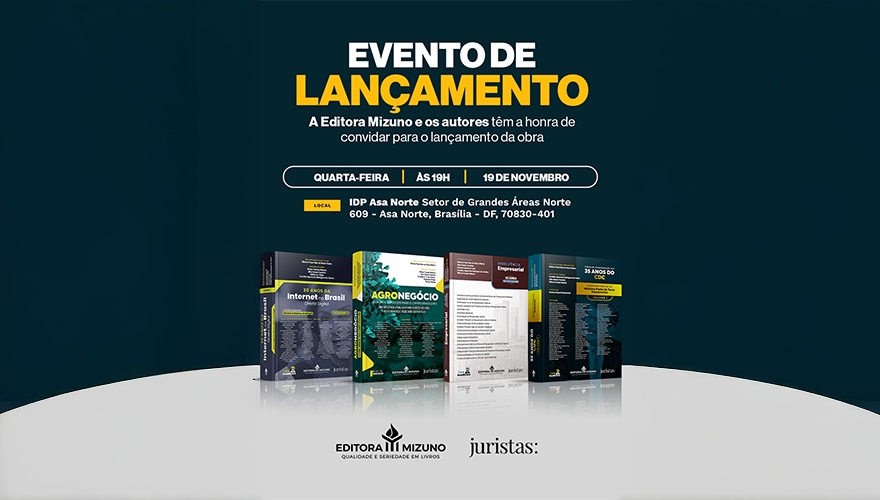 No dia 19/11, em Brasília, a Editora Mizuno lança quatro obras jurídicas que exploram temas atuais e essenciais para o universo do Direito. (Clique aqui)