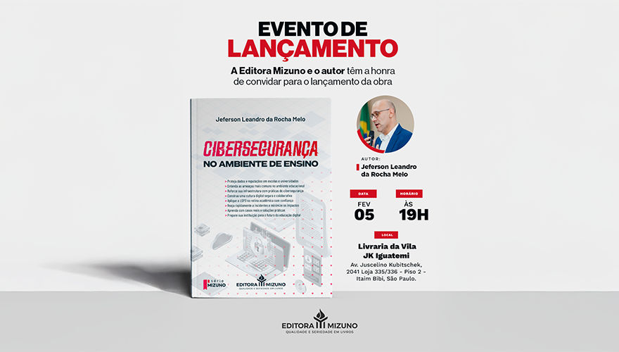 O livro "Cibersegurança no Ambiente de Ensino", de Jeferson Melo, publicado pela Editora Mizuno, aborda temas como proteção digital, privacidade e LGPD. O lançamento ocorre em 5/2, às 19h, na Livraria da Vila JK Iguatemi, em SP. (Clique aqui)
