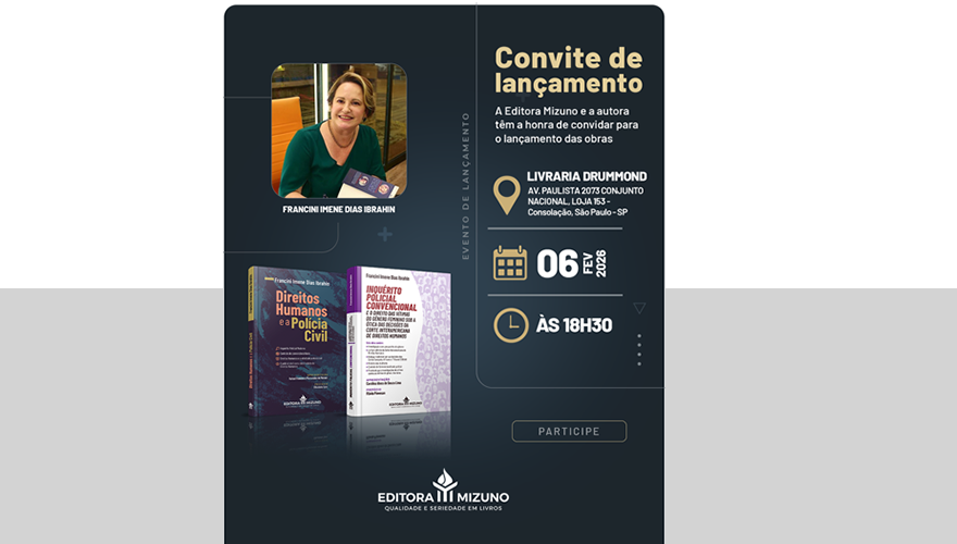 Editora Mizuno convida para o lançamento dos livros "Direitos Humanos e a Polícia Civil" e "Inquérito Policial Convencional", de Francini Imene Dias Ibrahin. O evento será realizado no dia 6/2, às 18h30, na Livraria Drummond, em SP. (Clique aqui)