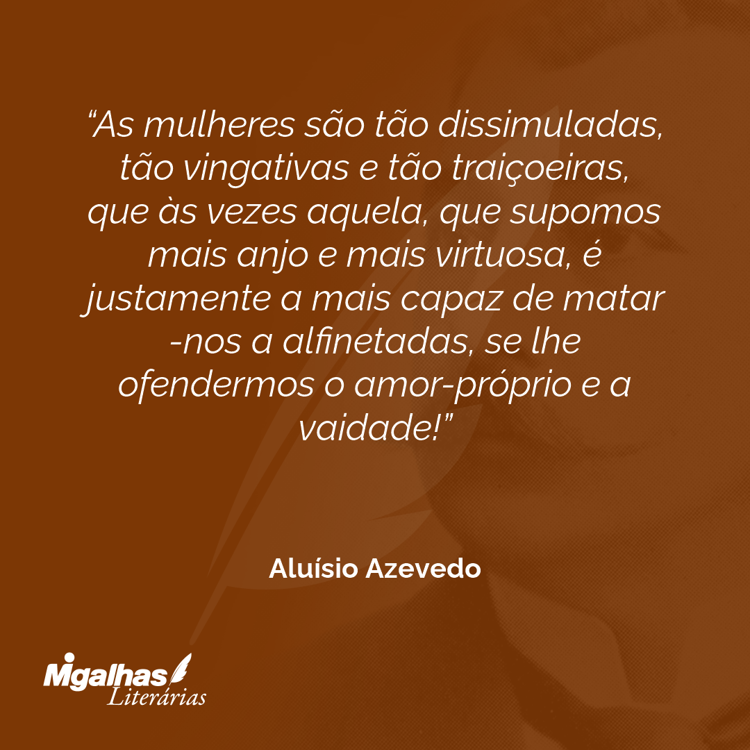 As mulheres são tão dissimuladas, tão vingativas e tão traiçoeiras, que às vezes aquela, que supomos mais anjo e mais virtuosa, é justamente a mais capaz de matar-nos a alfinetadas, se lhe ofendermos o amor-próprio e a vaidade!
