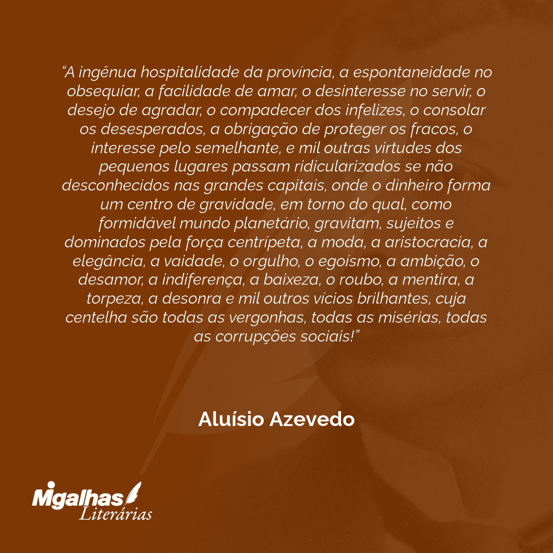 A ingênua hospitalidade da província, a espontaneidade no obsequiar, a facilidade de amar, o desinteresse no servir, o desejo de agradar, o compadecer dos infelizes, o consolar os desesperados, a obrigação de proteger os fracos, o interesse pelo semelhante, e mil outras virtudes dos pequenos lugares passam ridicularizados se não desconhecidos nas grandes capitais, onde o dinheiro forma um centro de gravidade, em torno do qual, como formidável mundo planetário, gravitam, sujeitos e dominados pela força centrípeta, a moda, a aristocracia, a elegância, a vaidade, o orgulho, o egoísmo, a ambição, o desamor, a indiferença, a baixeza, o roubo, a mentira, a torpeza, a desonra e mil outros vícios brilhantes, cuja centelha são todas as vergonhas, todas as misérias, todas as corrupções sociais!