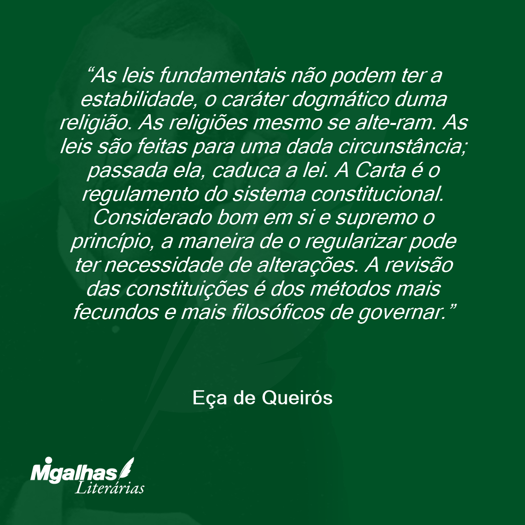 As leis fundamentais não podem ter a estabilidade, o caráter dogmático duma religião. As religiões mesmo se alte-ram. As leis são feitas para uma dada circunstância; passada ela, caduca a lei. A Carta é o regulamento do sistema constitucional. Considerado bom em si e supremo o princípio, a maneira de o regularizar pode ter necessidade de alterações. A revisão das constituições é dos métodos mais fecundos e mais filosóficos de governar.