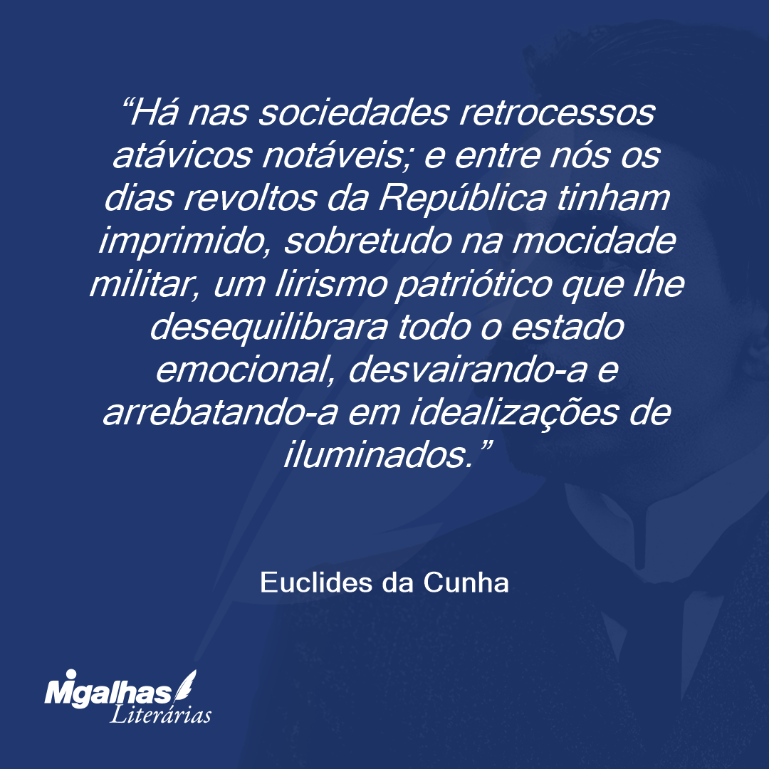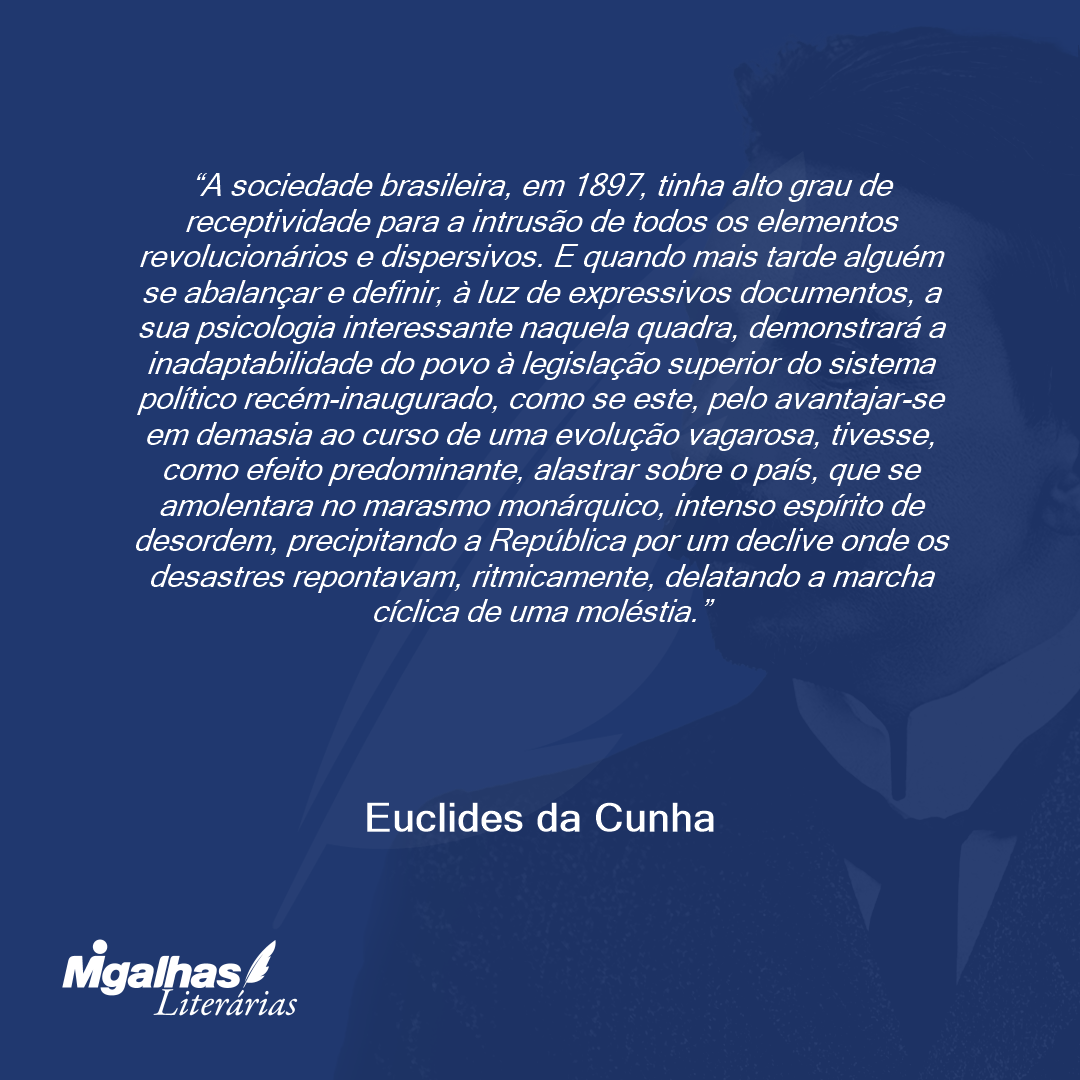 A sociedade brasileira, em 1897, tinha alto grau de receptividade para a intrusão de todos os elementos revolucionários e dispersivos. E quando mais tarde alguém se abalançar e definir, à luz de expressivos documentos, a sua psicologia interessante naquela quadra, demonstrará a inadaptabilidade do povo à legislação superior do sistema político recém-inaugurado, como se este, pelo avantajar-se em demasia ao curso de uma evolução vagarosa, tivesse, como efeito predominante, alastrar sobre o país, que se amolentara no marasmo monárquico, intenso espírito de desordem, precipitando a República por um declive onde os desastres repontavam, ritmicamente, delatando a marcha cíclica de uma moléstia.
