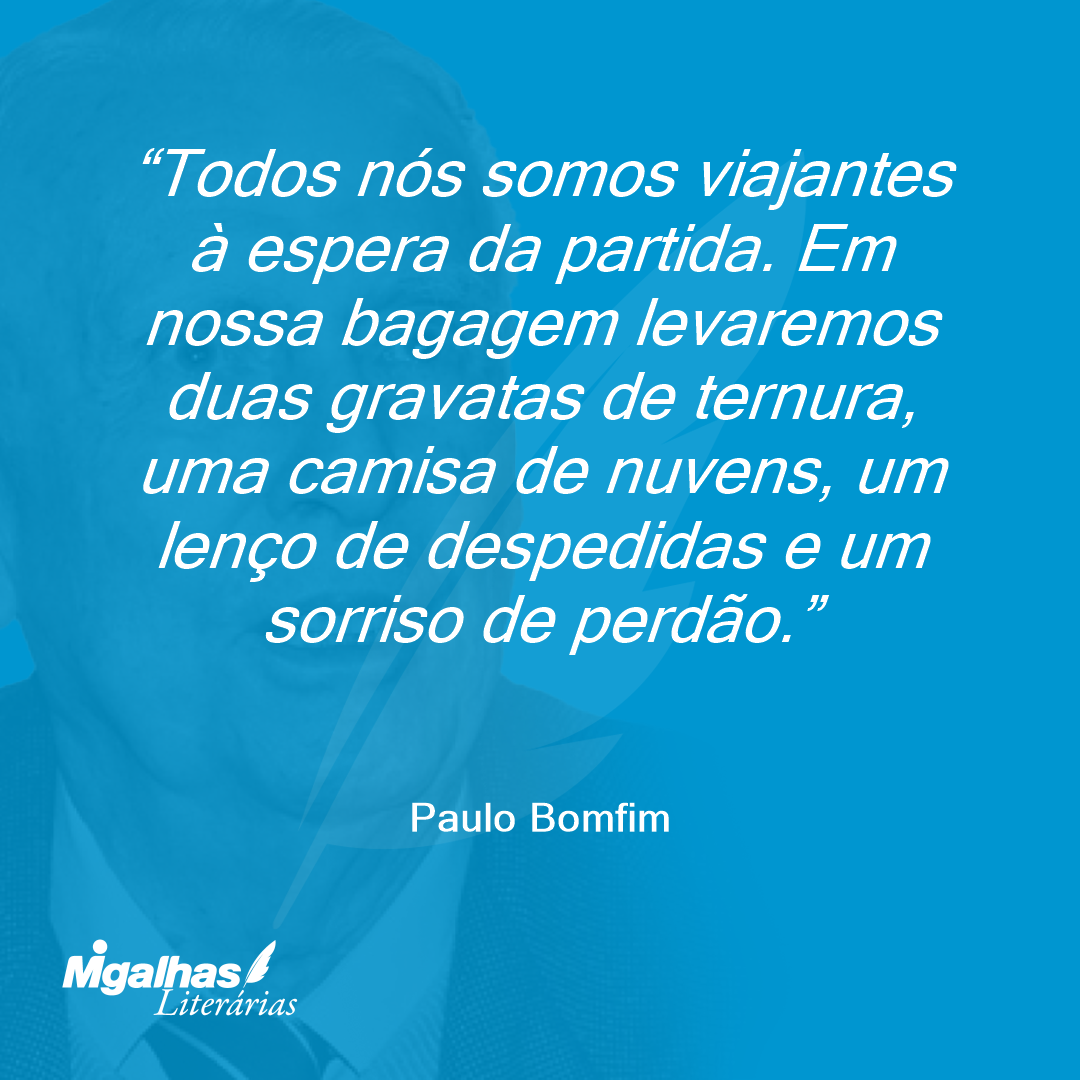 Todos nós somos viajantes à espera da partida. Em nossa bagagem levaremos duas gravatas de ternura, uma camisa de nuvens, um lenço de despedidas e um sorriso de perdão.
