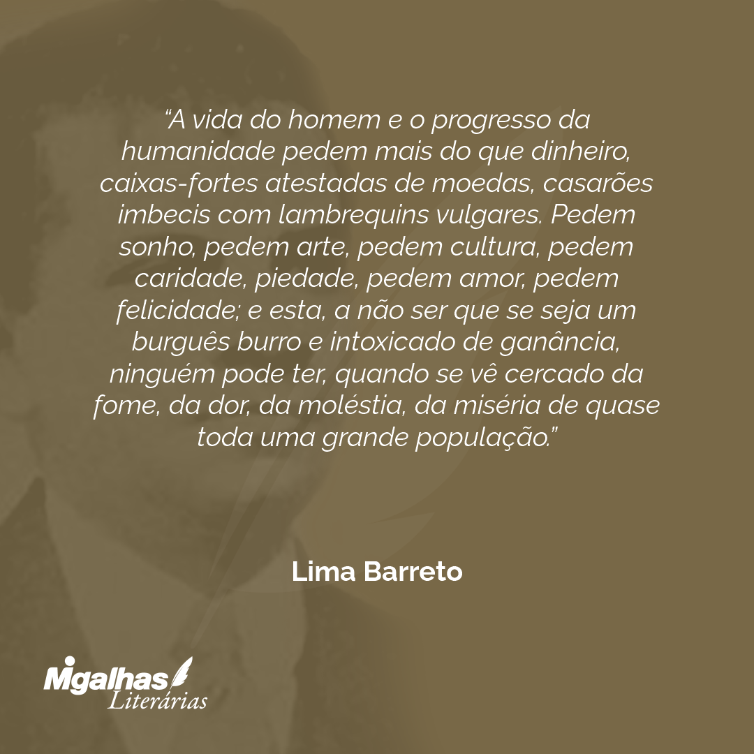 A vida do homem e o progresso da humanidade pedem mais do que dinheiro, caixas-fortes atestadas de moedas, casarões imbecis com lambrequins vulgares. Pedem sonho, pedem arte, pedem cultura, pedem caridade, piedade, pedem amor, pedem felicidade; e esta, a não ser que se seja um burguês burro e intoxicado de ganância, ninguém pode ter, quando se vê cercado da fome, da dor, da moléstia, da miséria de quase toda uma grande população.