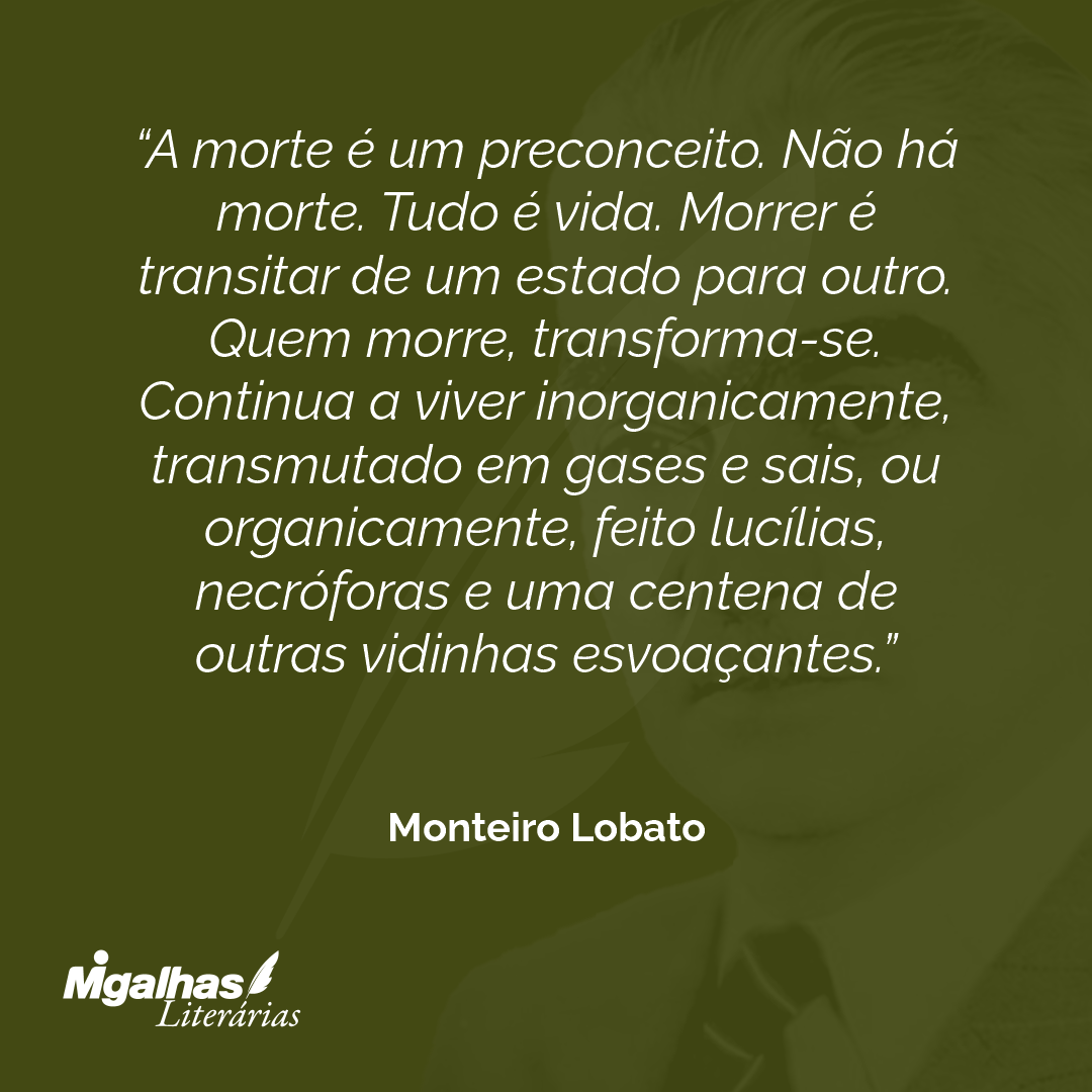 A morte é um preconceito. Não há morte. Tudo é vida. Morrer é transitar de um estado para outro. Quem morre, transforma-se. Continua a viver inorganicamente, transmutado em gases e sais, ou organicamente, feito lucílias, necróforas e uma centena de outras vidinhas esvoaçantes.