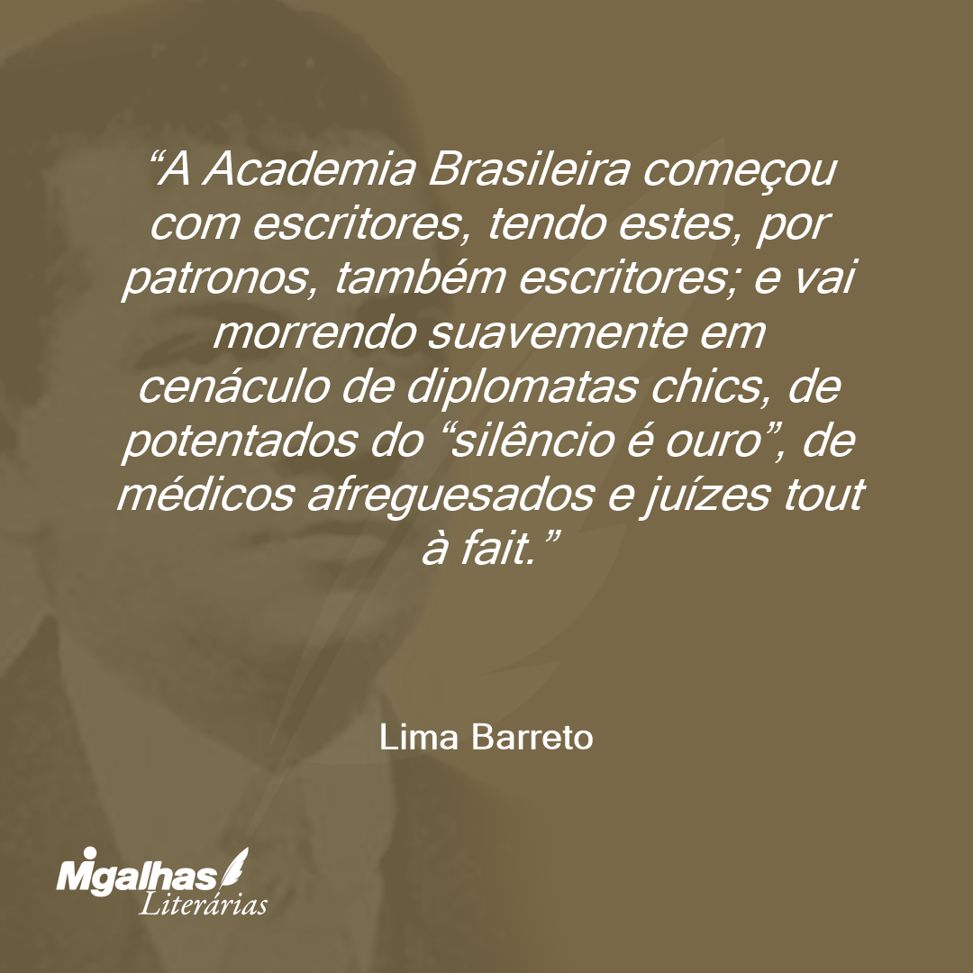 A Academia Brasileira começou com escritores, tendo estes, por patronos, também escritores; e vai morrendo suavemente em cenáculo de diplomatas chics, de potentados do “silêncio é ouro”, de médicos afreguesados e juízes tout à fait.