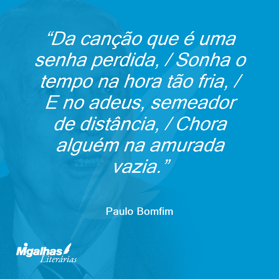 Da canção que é uma senha perdida, / Sonha o tempo na hora tão fria, / E no adeus, semeador de distância, / Chora alguém na amurada vazia.