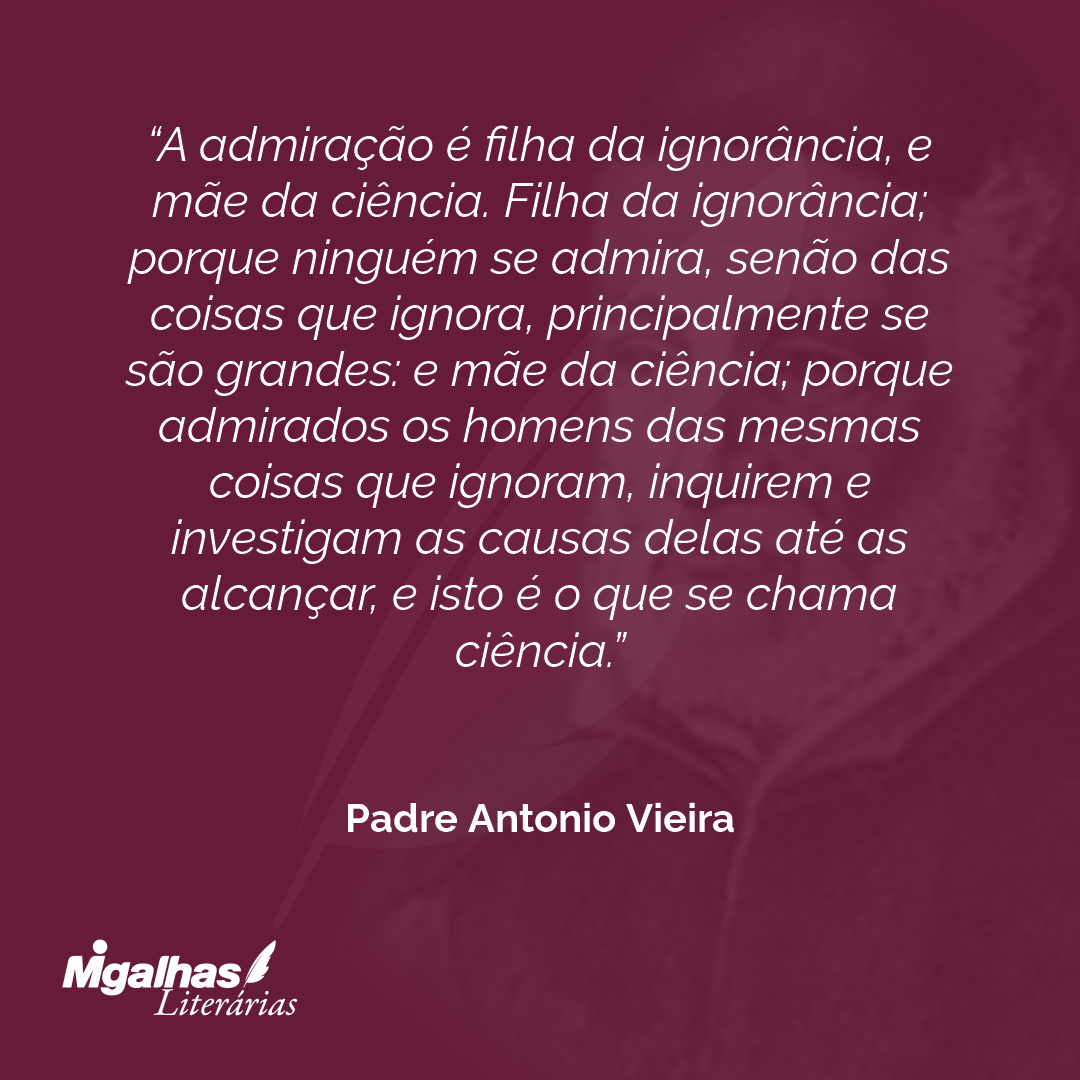 A admiração é filha da ignorância, e mãe da ciência. Filha da ignorância; porque ninguém se admira, senão das coisas que ignora, principalmente se são grandes: e mãe da ciência; porque admirados os homens das mesmas coisas que ignoram, inquirem e investigam as causas delas até as alcançar, e isto é o que se chama ciência.
