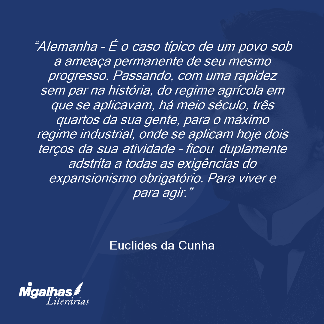 Alemanha – É o caso típico de um povo sob a ameaça permanente de seu mesmo progresso. Passando, com uma rapidez sem par na história, do regime agrícola em que se aplicavam, há meio século, três quartos da sua gente, para o máximo regime industrial, onde se aplicam hoje dois terços da sua atividade – ficou duplamente adstrita a todas as exigências do expansionismo obrigatório. Para viver e para agir.