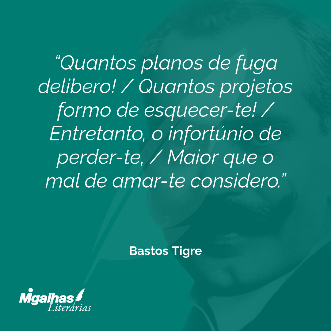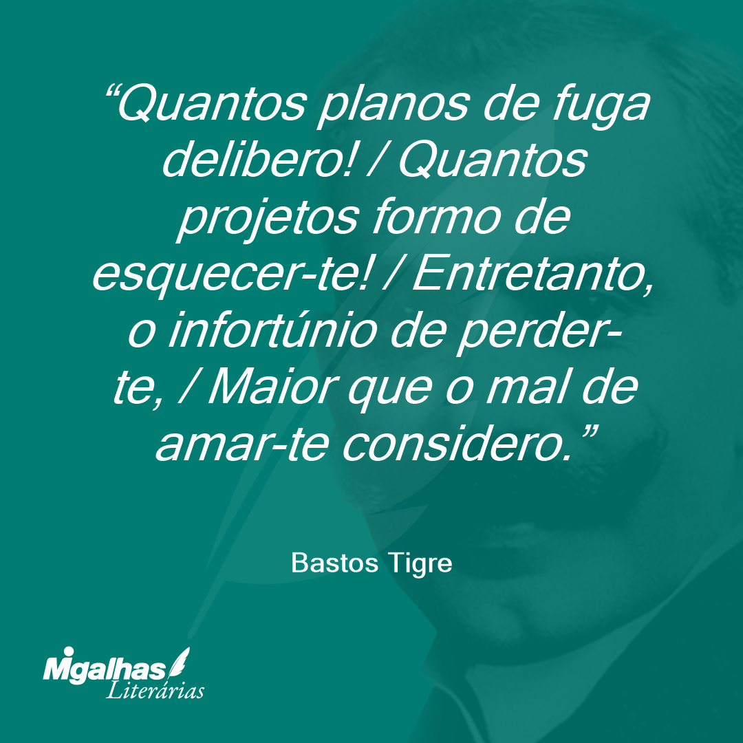 Quantos planos de fuga delibero! / Quantos projetos formo de esquecer-te! / Entretanto, o infortúnio de perder-te, / Maior que o mal de amar-te considero.