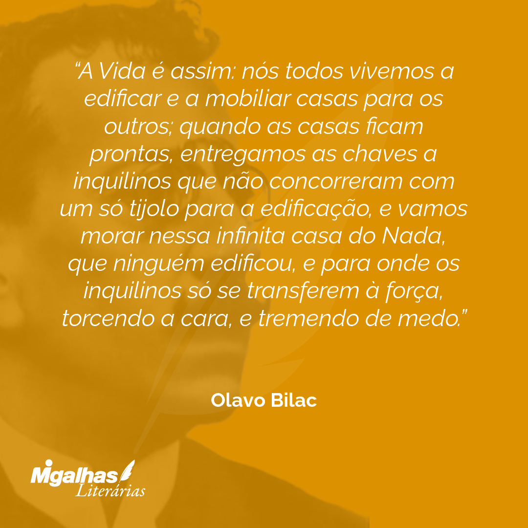 A Vida é assim: nós todos vivemos a edificar e a mobiliar casas para os outros; quando as casas ficam prontas, entregamos as chaves a inquilinos que não concorreram com um só tijolo para a edificação, e vamos morar nessa infinita casa do Nada, que ninguém edificou, e para onde os inquilinos só se transferem à força, torcendo a cara, e tremendo de medo.