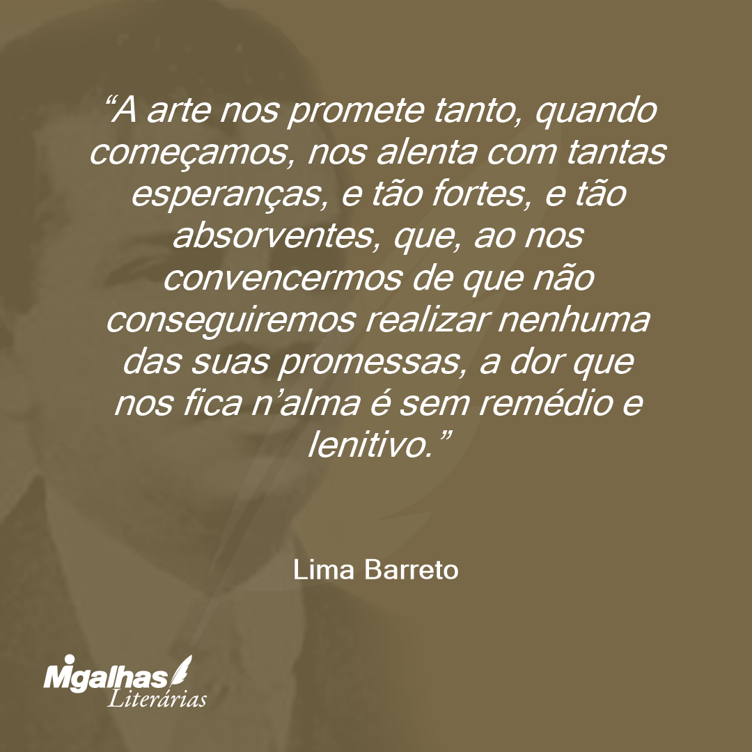 A arte nos promete tanto, quando começamos, nos alenta com tantas esperanças, e tão fortes, e tão absorventes, que, ao nos convencermos de que não conseguiremos realizar nenhuma das suas promessas, a dor que nos fica n’alma é sem remédio e lenitivo.