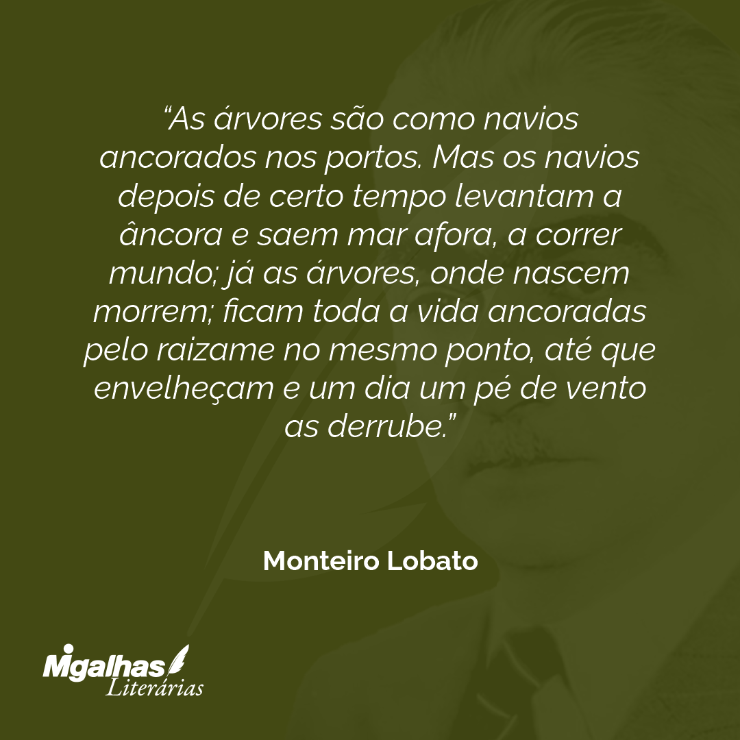 As árvores são como navios ancorados nos portos. Mas os navios depois de certo tempo levantam a âncora e saem mar afora, a correr mundo; já as árvores, onde nascem morrem; ficam toda a vida ancoradas pelo raizame no mesmo ponto, até que envelheçam e um dia um pé de vento as derrube.