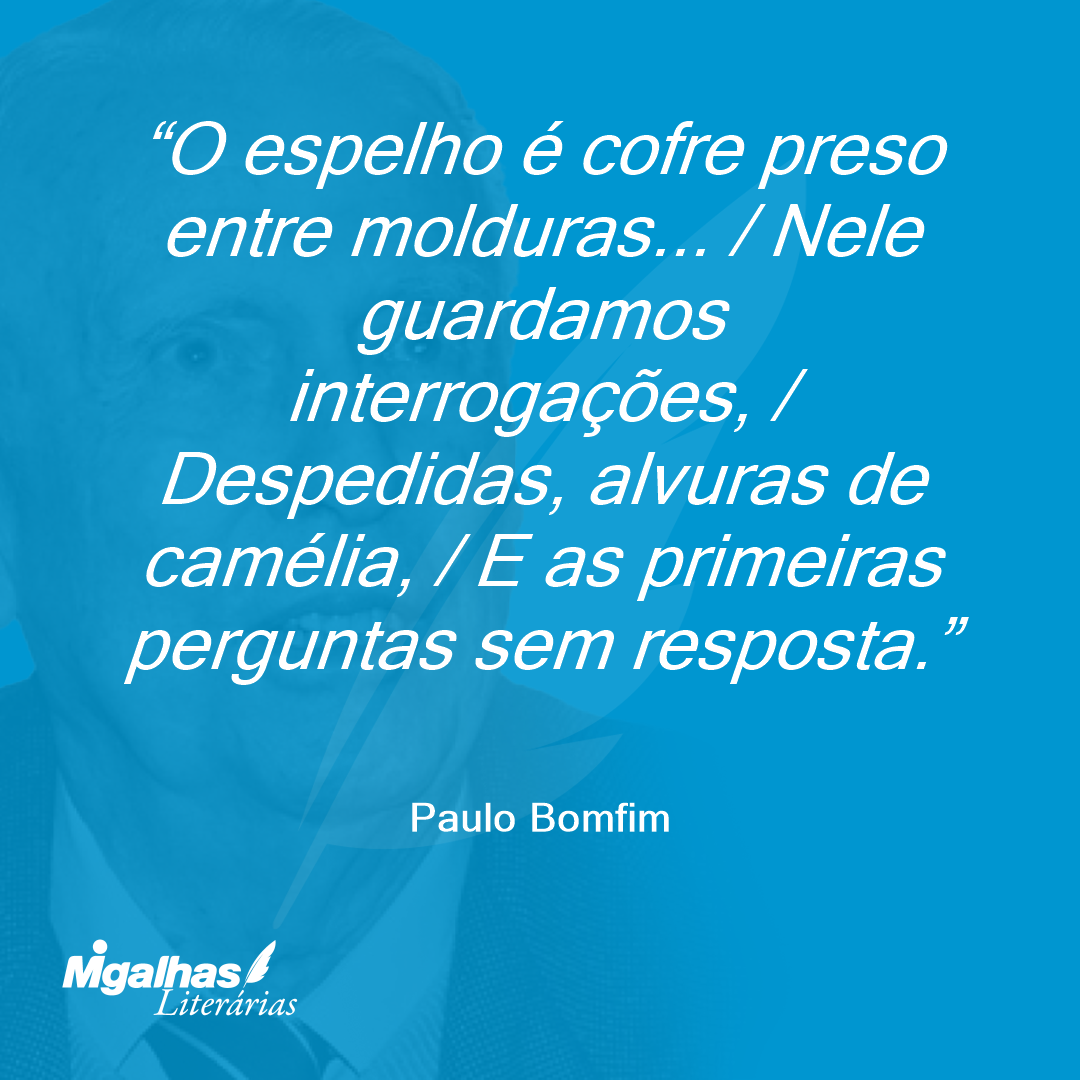 O espelho é cofre preso entre molduras... / Nele guardamos interrogações, / Despedidas, alvuras de camélia, / E as primeiras perguntas sem resposta.