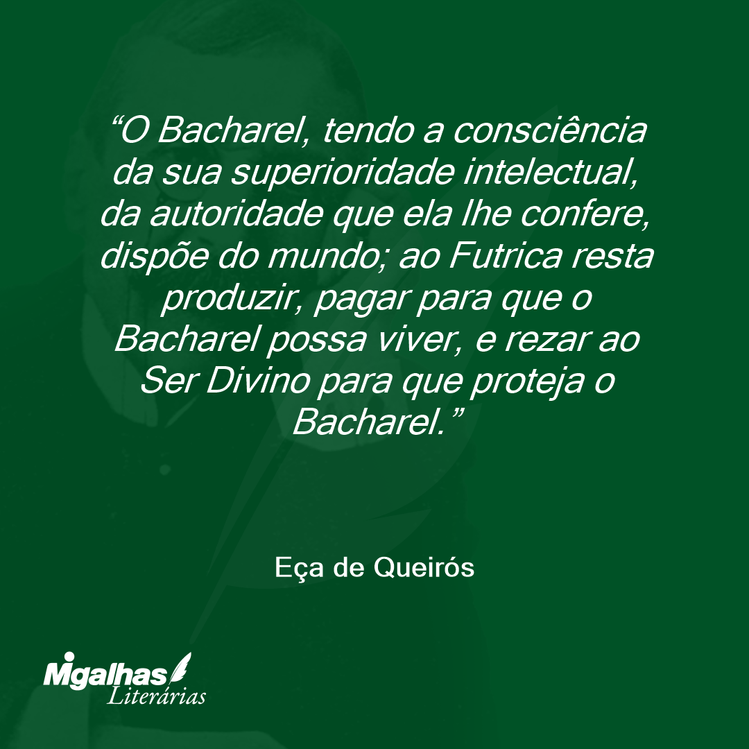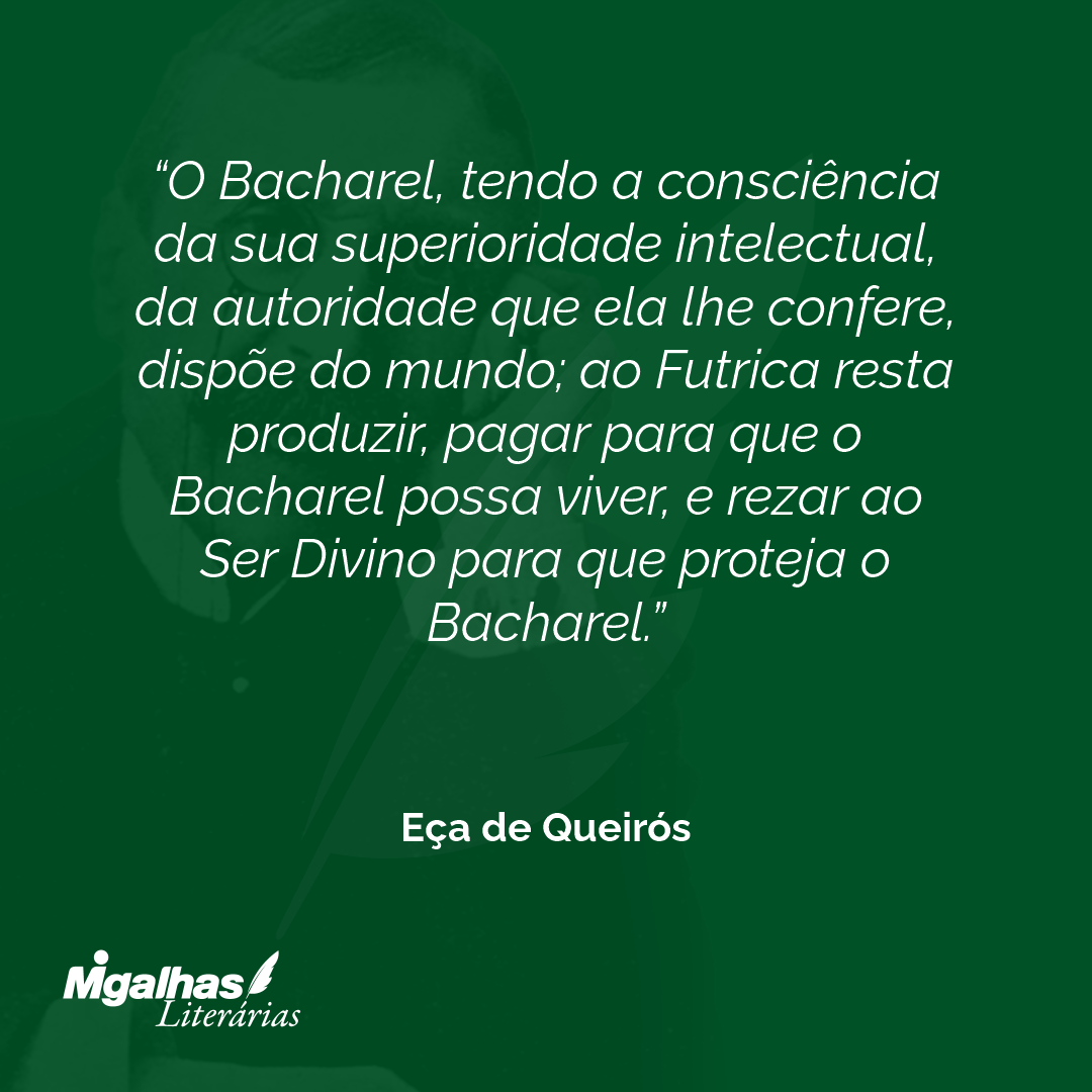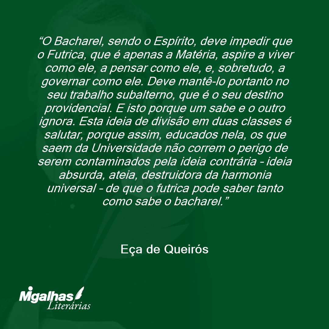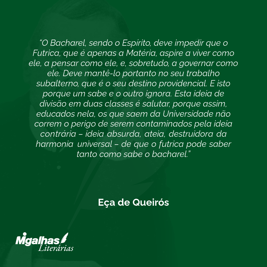 O Bacharel, sendo o Espírito, deve impedir que o Futrica, que é apenas a Matéria, aspire a viver como ele, a pensar como ele, e, sobretudo, a governar como ele. Deve mantê-lo portanto no seu trabalho subalterno, que é o seu destino providencial. E isto porque um sabe e o outro ignora. Esta ideia de divisão em duas classes é salutar, porque assim, educados nela, os que saem da Universidade não correm o perigo de serem contaminados pela ideia contrária – ideia absurda, ateia, destruidora da harmonia universal – de que o futrica pode saber tanto como sabe o bacharel.