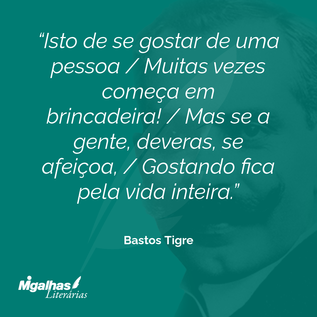 Isto de se gostar de uma pessoa / Muitas vezes começa em brincadeira! / Mas se a gente, deveras, se afeiçoa, / Gostando fica pela vida inteira.