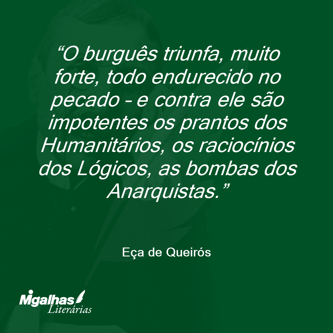O burguês triunfa, muito forte, todo endurecido no pecado – e contra ele são impotentes os prantos dos Humanitários, os raciocínios dos Lógicos, as bombas dos Anarquistas.