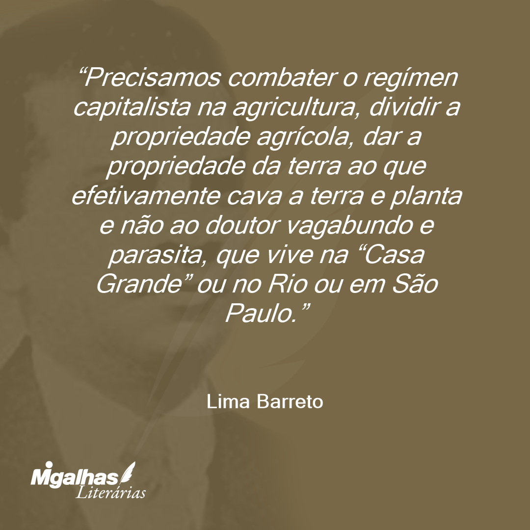 Precisamos combater o regímen capitalista na agricultura, dividir a propriedade agrícola, dar a propriedade da terra ao que efetivamente cava a terra e planta e não ao doutor vagabundo e parasita, que vive na “Casa Grande” ou no Rio ou em São Paulo.