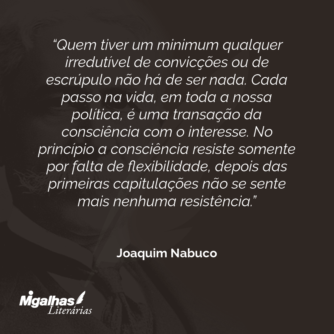 Quem tiver um minimum qualquer irredutível de convicções ou de escrúpulo não há de ser nada. Cada passo na vida, em toda a nossa política, é uma transação da consciência com o interesse. No princípio a consciência resiste somente por falta de flexibilidade, depois das primeiras capitulações não se sente mais nenhuma resistência.