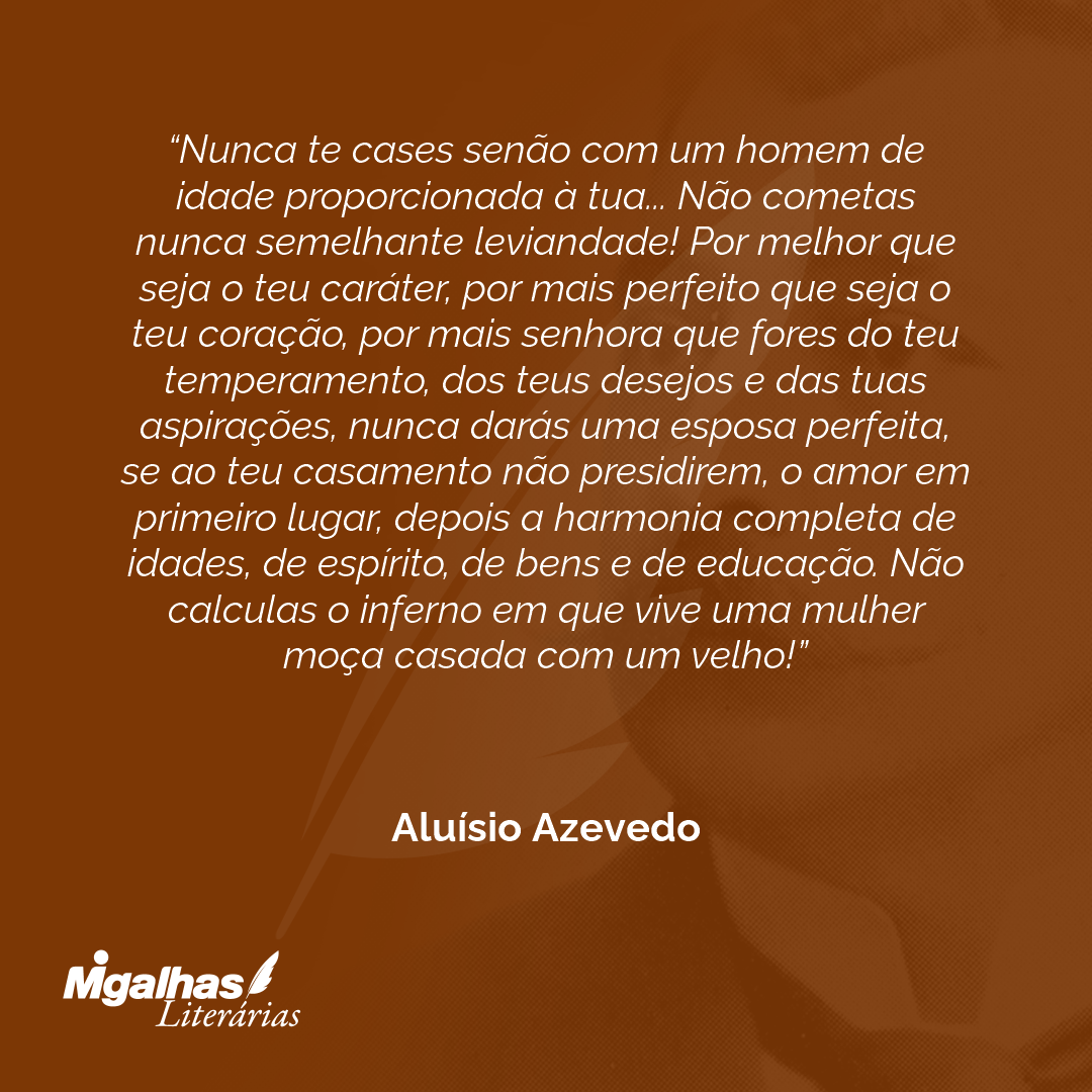 Nunca te cases senão com um homem de idade proporcionada à tua... Não cometas nunca semelhante leviandade! Por melhor que seja o teu caráter, por mais perfeito que seja o teu coração, por mais senhora que fores do teu temperamento, dos teus desejos e das tuas aspirações, nunca darás uma esposa perfeita, se ao teu casamento não presidirem, o amor em primeiro lugar, depois a harmonia completa de idades, de espírito, de bens e de educação. Não calculas o inferno em que vive uma mulher moça casada com um velho!