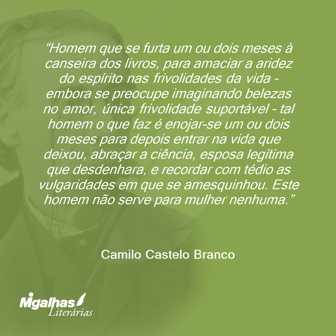 Homem que se furta um ou dois meses à canseira dos livros, para amaciar a aridez do espírito nas frivolidades da vida – embora se preocupe imaginando belezas no amor, única frivolidade suportável – tal homem o que faz é enojar-se um ou dois meses para depois entrar na vida que deixou, abraçar a ciência, esposa legítima que desdenhara, e recordar com tédio as vulgaridades em que se amesquinhou. Este homem não serve para mulher nenhuma.