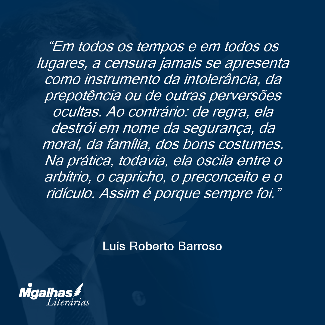 Em todos os tempos e em todos os lugares, a censura jamais se apresenta como instrumento da intolerância, da prepotência ou de outras perversões ocultas. Ao contrário: de regra, ela destrói em nome da segurança, da moral, da família, dos bons costumes. Na prática, todavia, ela oscila entre o arbítrio, o capricho, o preconceito e o ridículo. Assim é porque sempre foi.