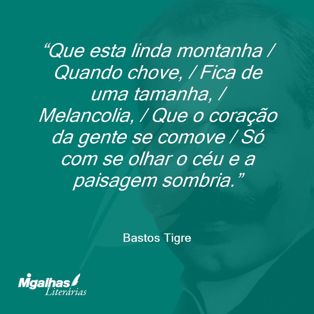 Que esta linda montanha / Quando chove, / Fica de uma tamanha, / Melancolia, / Que o coração da gente se comove / Só com se olhar o céu e a paisagem sombria.