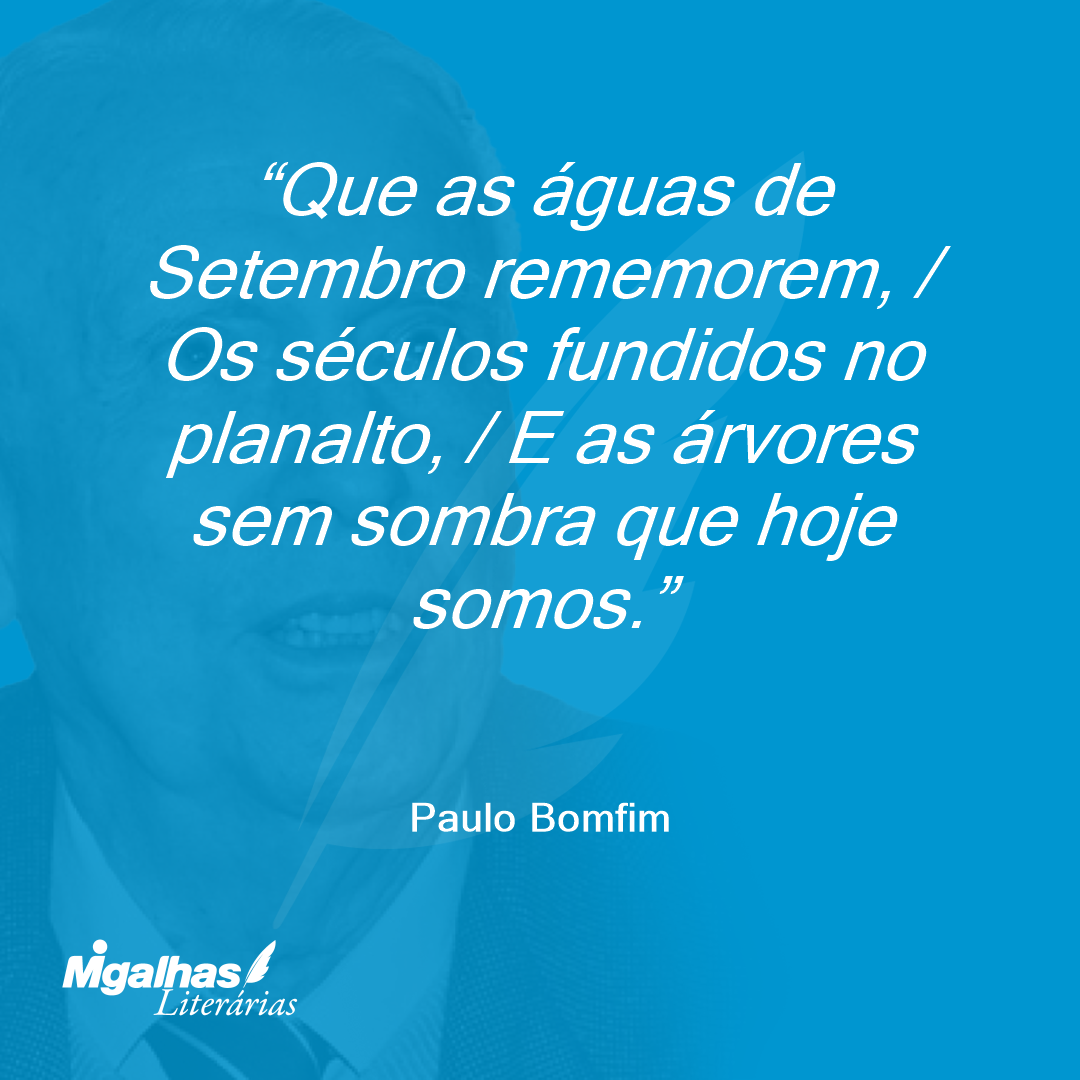 Que as águas de Setembro rememorem, / Os séculos fundidos no planalto, / E as árvores sem sombra que hoje somos.