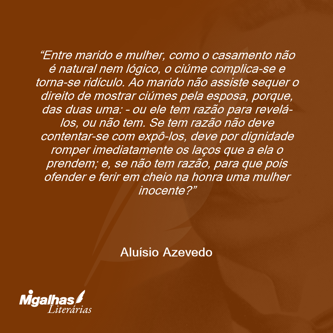 Entre marido e mulher, como o casamento não é natural nem lógico, o ciúme complica-se e torna-se ridículo. Ao marido não assiste sequer o direito de mostrar ciúmes pela esposa, porque, das duas uma: – ou ele tem razão para revelá-los, ou não tem. Se tem razão não deve contentar-se com expô-los, deve por dignidade romper imediatamente os laços que a ela o prendem; e, se não tem razão, para que pois ofender e ferir em cheio na honra uma mulher inocente?