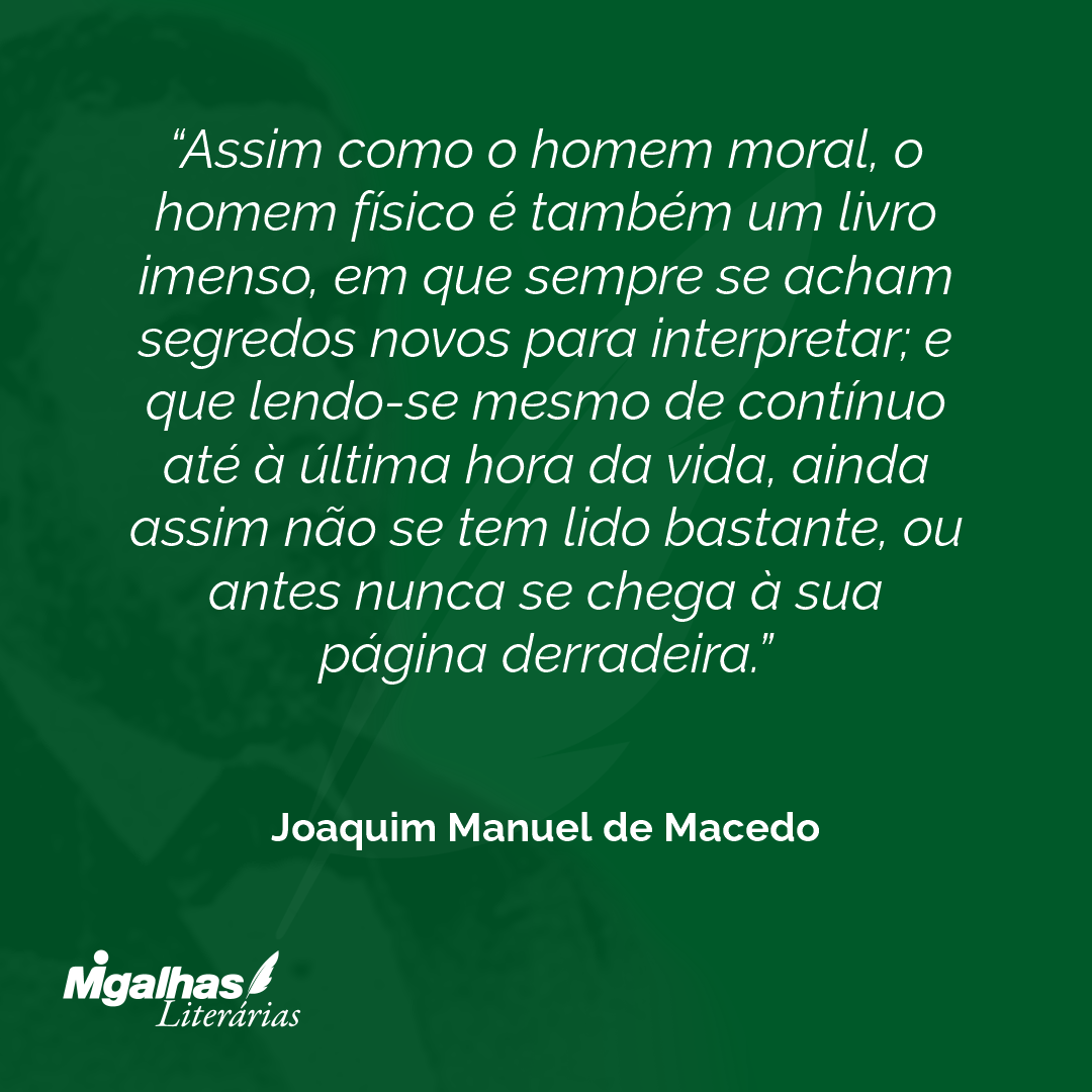 Assim como o homem moral, o homem físico é também um livro imenso, em que sempre se acham segredos novos para interpretar; e que lendo-se mesmo de contínuo até à última hora da vida, ainda assim não se tem lido bastante, ou antes nunca se chega à sua página derradeira.