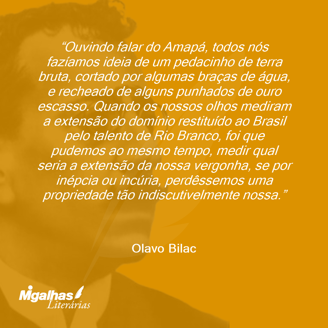 Ouvindo falar do Amapá, todos nós fazíamos ideia de um pedacinho de terra bruta, cortado por algumas braças de água, e recheado de alguns punhados de ouro escasso. Quando os nossos olhos mediram a extensão do domínio restituído ao Brasil pelo talento de Rio Branco, foi que pudemos ao mesmo tempo, medir qual seria a extensão da nossa vergonha, se por inépcia ou incúria, perdêssemos uma propriedade tão indiscutivelmente nossa.