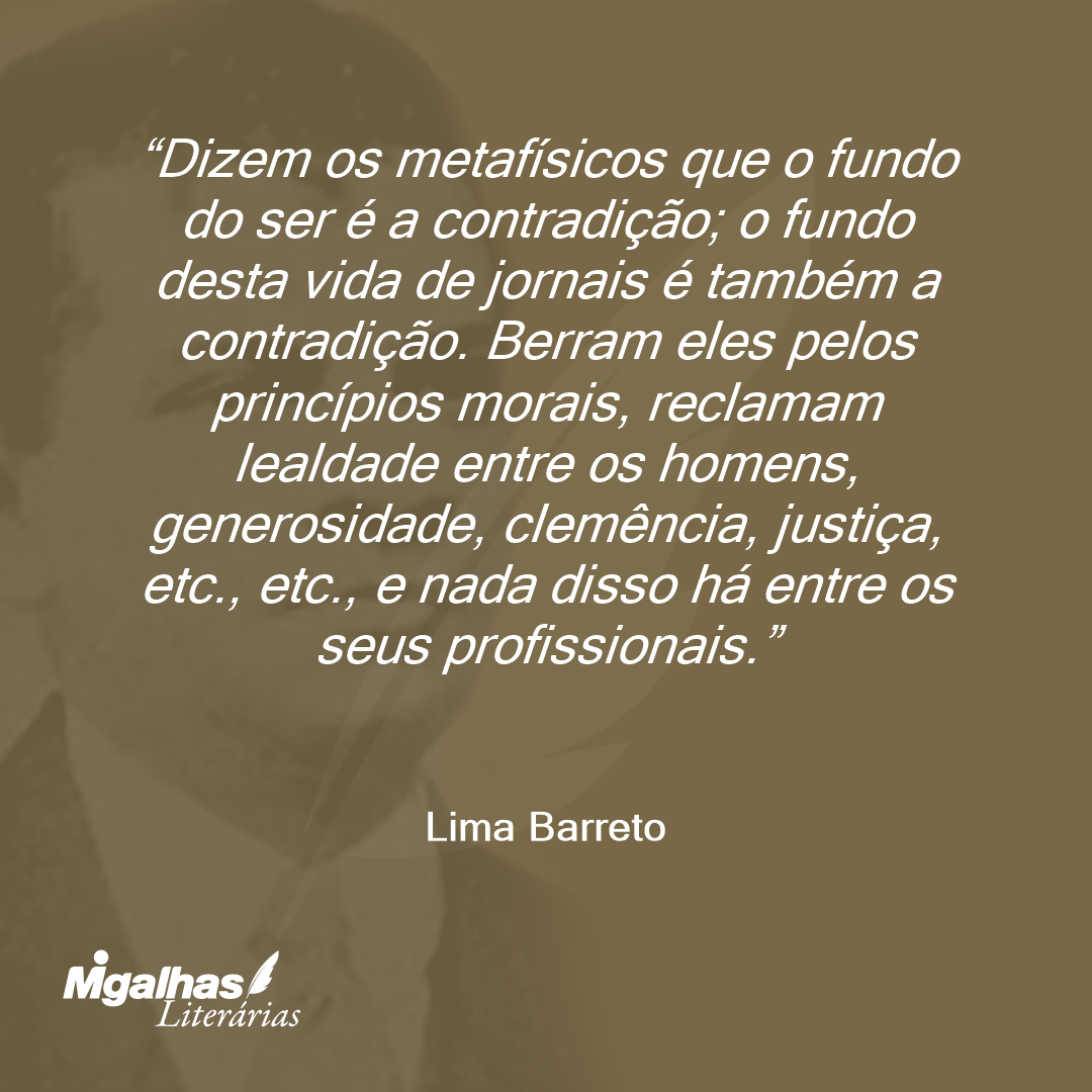 Dizem os metafísicos que o fundo do ser é a contradição; o fundo desta vida de jornais é também a contradição. Berram eles pelos princípios morais, reclamam lealdade entre os homens, generosidade, clemência, justiça, etc., etc., e nada disso há entre os seus profissionais.