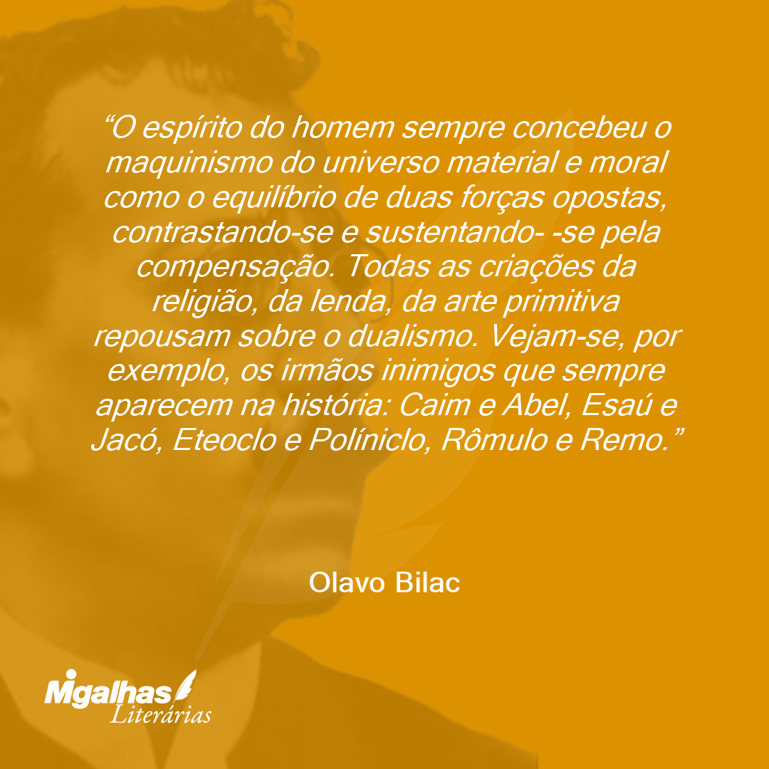 O espírito do homem sempre concebeu o maquinismo do universo material e moral como o equilíbrio de duas forças opostas, contrastando-se e sustentando- -se pela compensação. Todas as criações da religião, da lenda, da arte primitiva repousam sobre o dualismo. Vejam-se, por exemplo, os irmãos inimigos que sempre aparecem na história: Caim e Abel, Esaú e Jacó, Eteoclo e Políniclo, Rômulo e Remo.