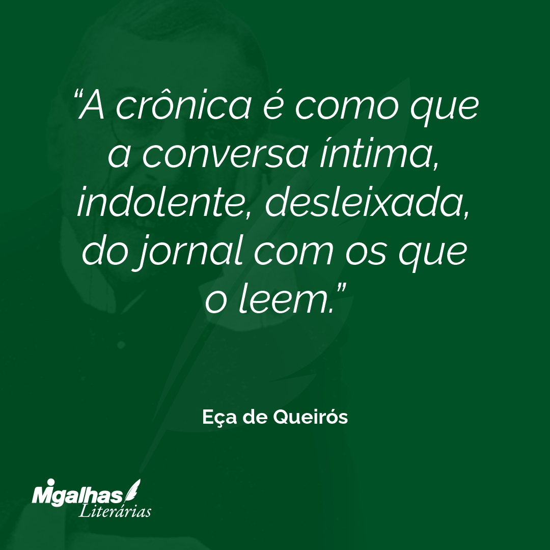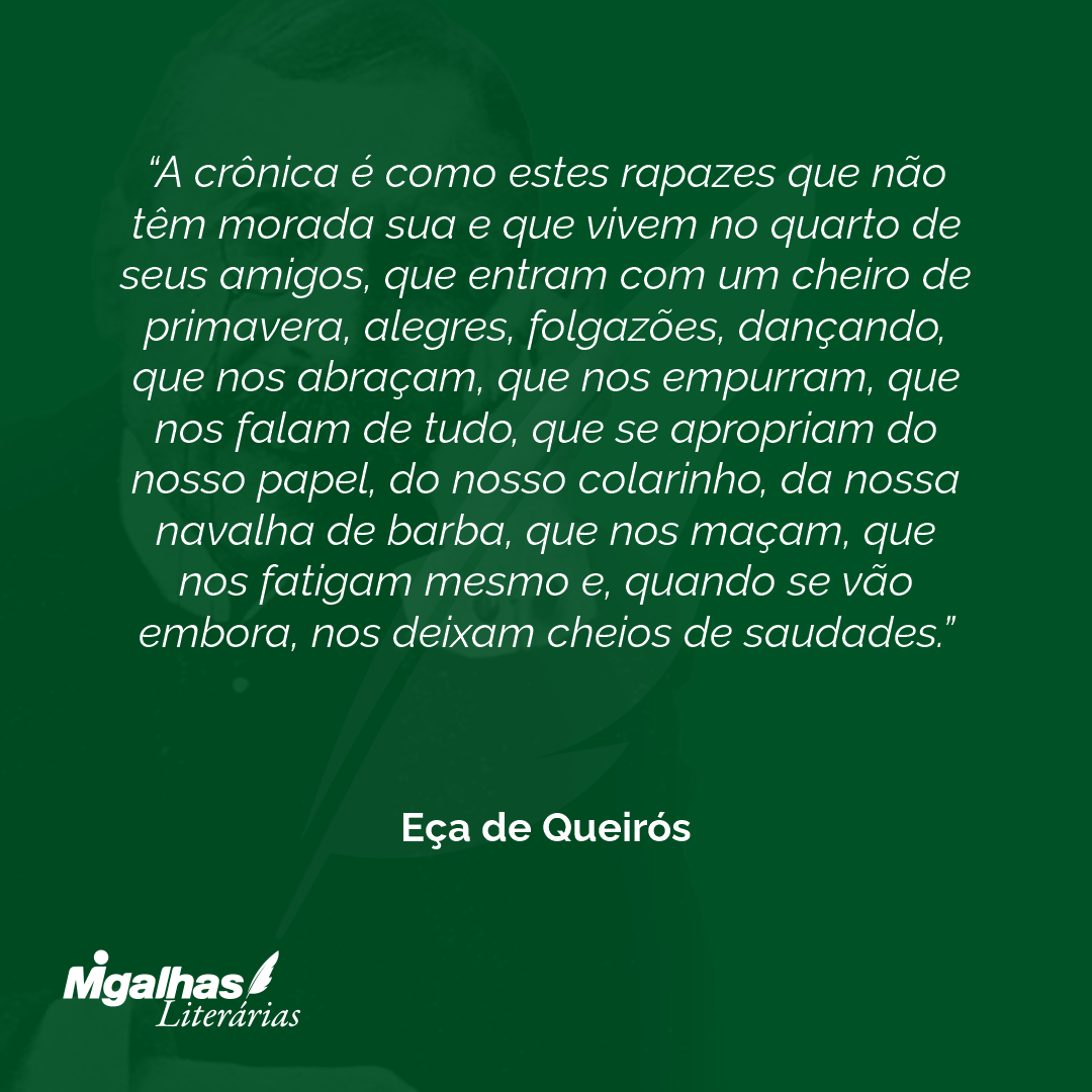 A crônica é como estes rapazes que não têm morada sua e que vivem no quarto de seus amigos, que entram com um cheiro de primavera, alegres, folgazões, dançando, que nos abraçam, que nos empurram, que nos falam de tudo, que se apropriam do nosso papel, do nosso colarinho, da nossa navalha de barba, que nos maçam, que nos fatigam mesmo e, quando se vão embora, nos deixam cheios de saudades.