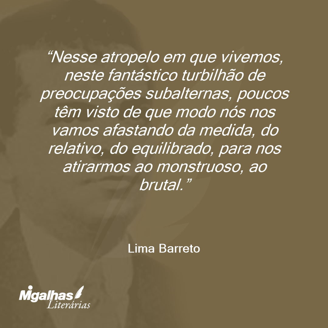 Nesse atropelo em que vivemos, neste fantástico turbilhão de preocupações subalternas, poucos têm visto de que modo nós nos vamos afastando da medida, do relativo, do equilibrado, para nos atirarmos ao monstruoso, ao brutal.