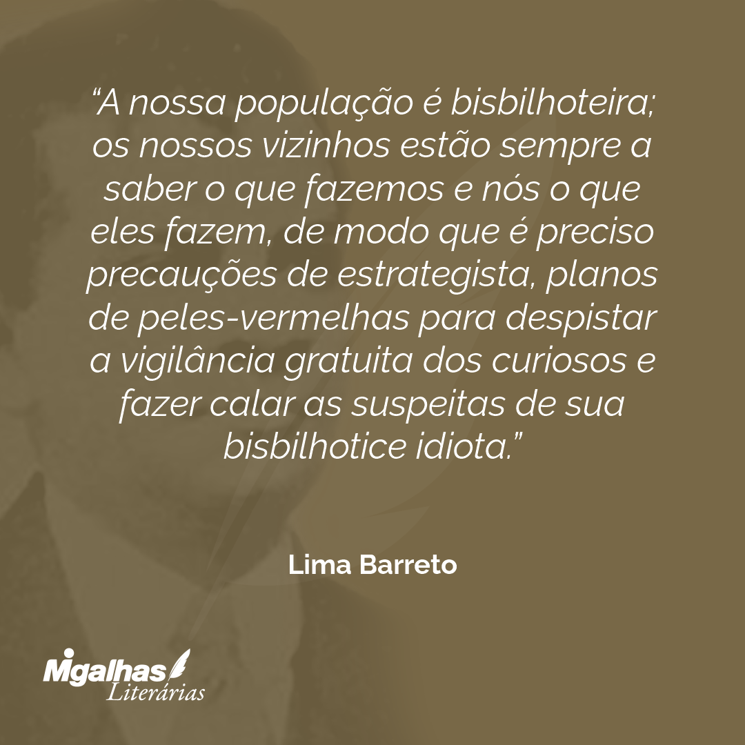 A nossa população é bisbilhoteira; os nossos vizinhos estão sempre a saber o que fazemos e nós o que eles fazem, de modo que é preciso precauções de estrategista, planos de peles-vermelhas para despistar a vigilância gratuita dos curiosos e fazer calar as suspeitas de sua bisbilhotice idiota.