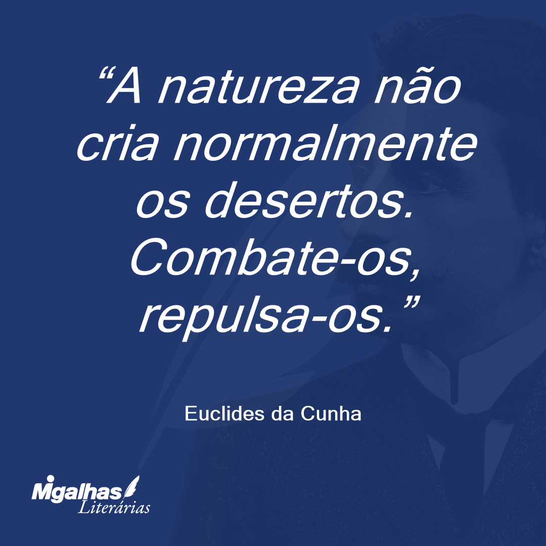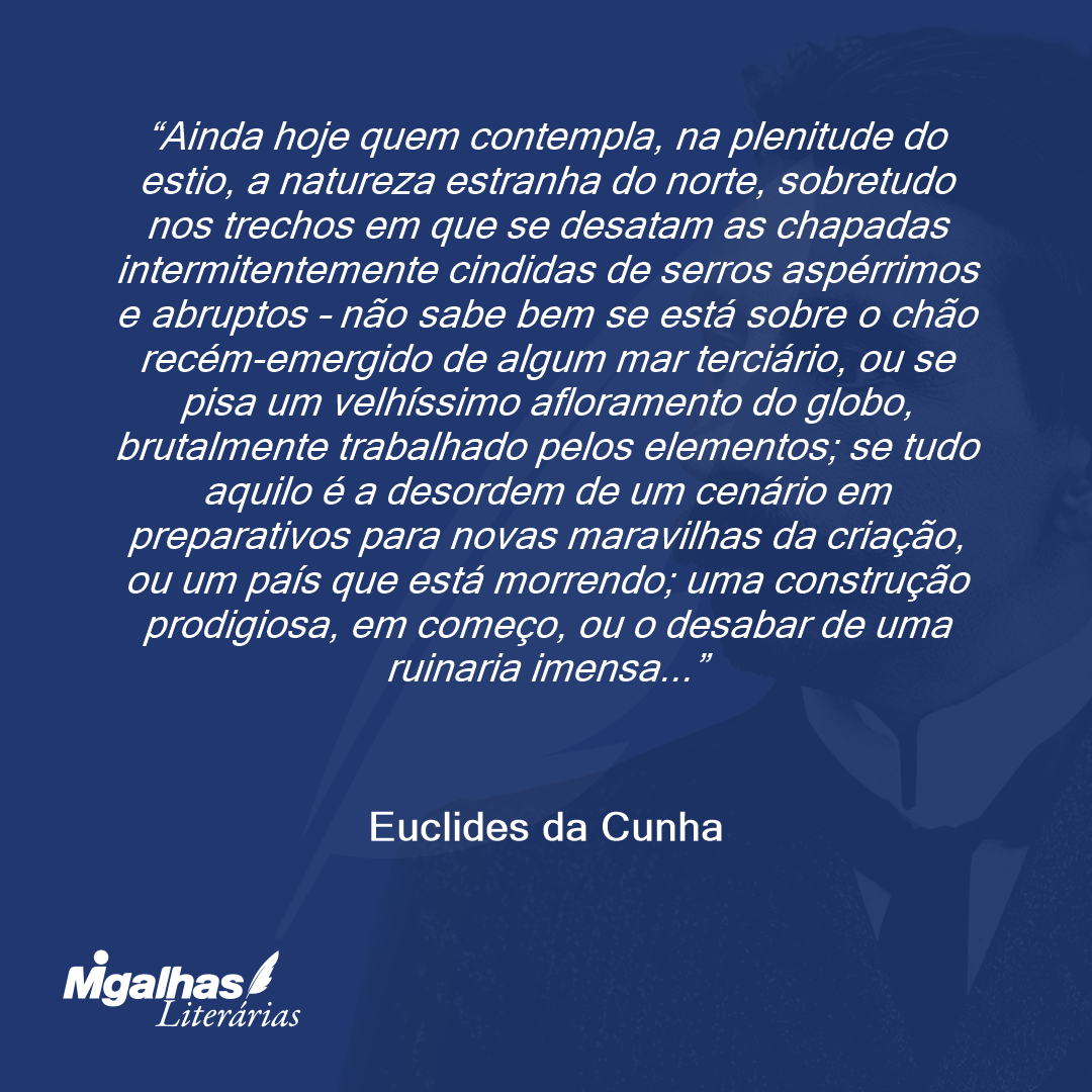 Ainda hoje quem contempla, na plenitude do estio, a natureza estranha do norte, sobretudo nos trechos em que se desatam as chapadas intermitentemente cindidas de serros aspérrimos e abruptos – não sabe bem se está sobre o chão recém-emergido de algum mar terciário, ou se pisa um velhíssimo afloramento do globo, brutalmente trabalhado pelos elementos; se tudo aquilo é a desordem de um cenário em preparativos para novas maravilhas da criação, ou um país que está morrendo; uma construção prodigiosa, em começo, ou o desabar de uma ruinaria imensa...